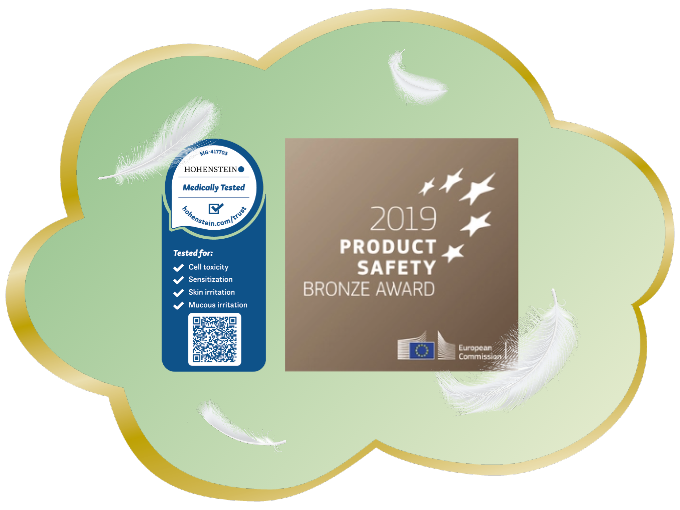 Οι μόνες με Βραβείο Ασφάλειας Προϊόντος από την Ευρωπαϊκή Επιτροπή, για το ιδιαίτερα υψηλό επίπεδο ασφάλειας που προσφέρουν προς το βρεφικό δέρμα, έπειτα από αυστηρή αξιολόγηση από ειδική κριτική επιτροπή της ΕΕ.